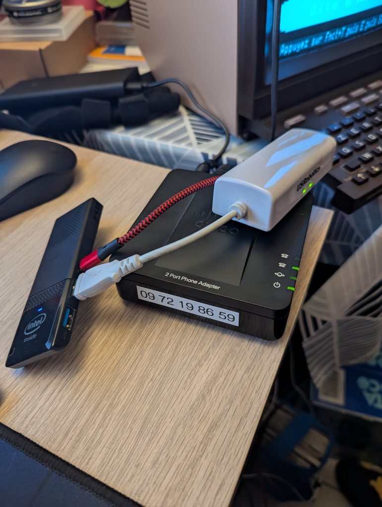 Initialement, le serveur utilisait une passerelle VoIP Cisco SPA112 configurée en SIP, avec une ligne OVH accessible au 09 72 19 86 59. Après une interruption en 2024 due à un changement de serveur, le service a été relancé le 25 septembre 2025 sur l’Intel Compute Stick, avant d’être définitivement migré vers le Proliant HP DL 380 Gen 9 le 13 octobre 2025.